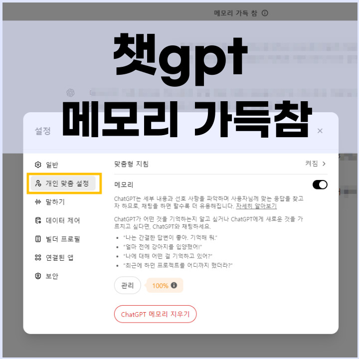 챗지피티가 대화 중 나눈 내용을 메모리에 저장하기 때문에 메모리 관리에 들어가서 불필요한 메모리를 삭제해야하는데요.