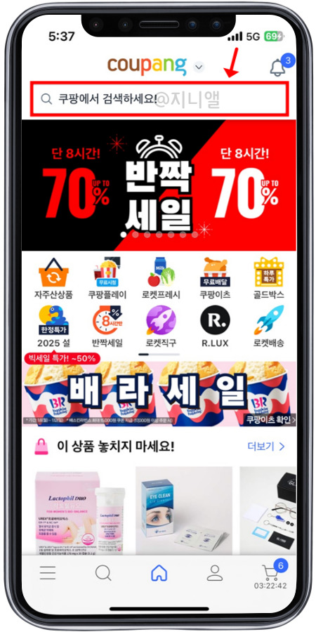 첫째, 쿠팡 앱에 들어간 뒤 검색어 입력창에 들어가주세요.